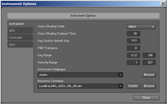 The Intrument Options dialog should now appear in Kontakt: