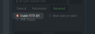 The Articulate HTTP JSON API is disabled by default. You can turn it on in the new 'Advanced' section of the configuration panel. Simply click HTTP JSON API so that it lights up. The API will now start and listen on Port 8000. The setting is remembered by Articulate. If you close FL Studio and re-open, with an instance of Articulate, the API will automatically run. To permentantly deactivate the API, simply click the HTTP JSON API option to off.