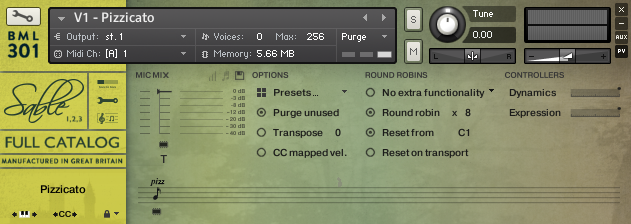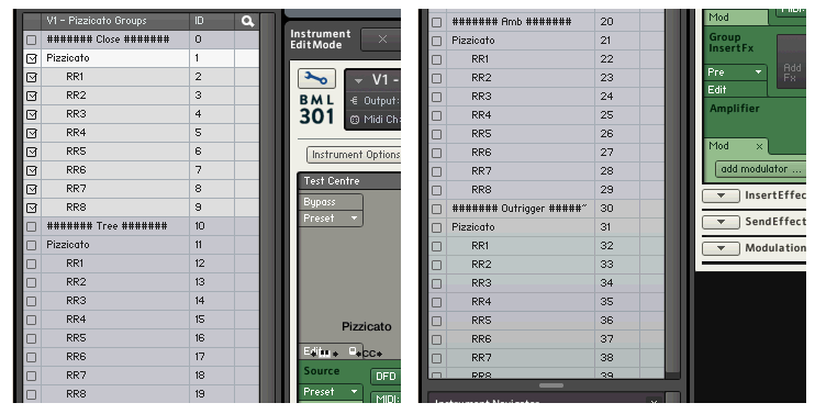 Clearing out the mic signals you don't need should be incredibly simple. In this example I'm going to demonstrate how to clean up a Sable patch, but it should be very similar on any recent Spitfire instrument. First, lets open up the V1 - Pizzicato patch from the _Individual brushes_ and take a look at the groups within it: