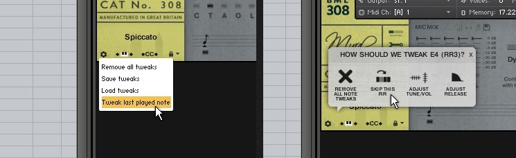 ) and select Tweak last note played. The COG tweak menu will appear. Simply click SKIP THIS RR. The round-robin will now be ignored when playing this specific note and articulation. COG tweaks remain persistent in your DAW session, and are also saved within NKIs. For more detailed information on using the COG, I'd recommended you read the product manual.