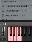 ). Look for the option Reset From under the ROUND-ROBINS menu. In Mural, this defaults to C-1 in all patches on the Kontakt keyboard, though it can differ for other products and instruments.