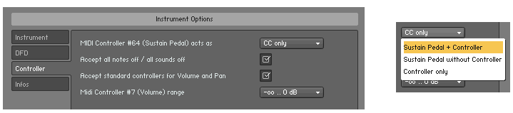 From the Controller page, change the topmost option MIDI Controller #64 (Sustain Pedal) acts as from CC only to Sustain Pedal + Controller. Hit close and the sustain pedal should now work (though as mentioned, the release samples will not work correctly).